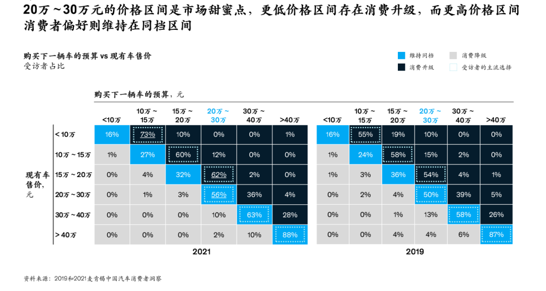 In the current stock market, consumer upgrading is still the main trend. Taking car owners with current prices below 200,000 yuan as an example, more than 60% of the respondents stated that their next car purchase budget has increased. It is most appropriate for automakers to improve their operating efficiency by laying out an incremental price range of 200,000 to 300,000 yuan.